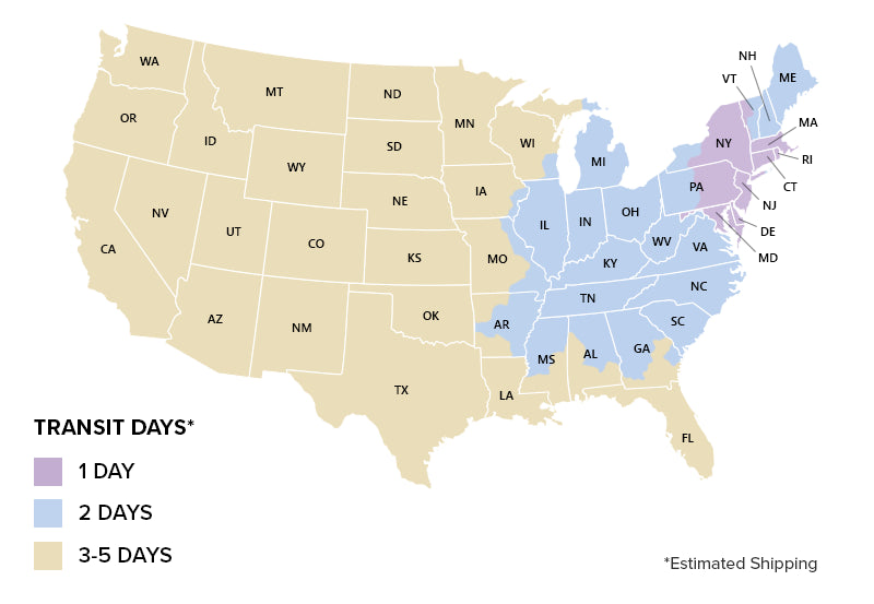Fragrance Ner USA will gladly pay for ground shipping on every order valued over $100 within the United States. However, should you return an item, the cost of shipping will be deducted from your total refund. Every item shipped out of our warehouse is fully insured. Orders outside the 48 continental States require Second Day or Next Day Air service. PO, APO, FPO or DPO addresses must be shipped by USPS. Standard ground shipping can range from 1 to 6 business days. Please view the map below for transit time estimation. Express shipping options are available; see below.