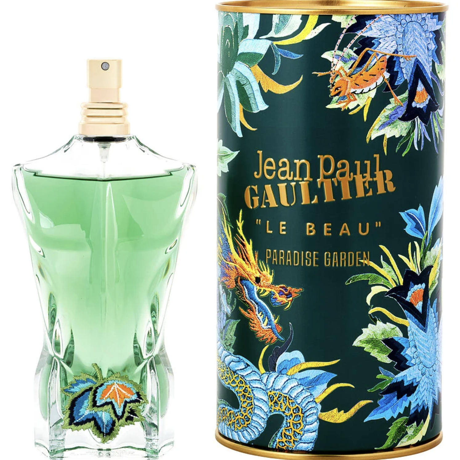 Le Beau Paradise Garden is a woody, green-aquatic men’s cologne with notes of fresh and salty coconut, green fig and sensual sandalwood. This Eau de Parfum is housed in the iconic Jean Paul Gaultier torso-shaped bottle, embroidered with a vine leaf plucked from the Garden of Gaultier. Let yourself be captivated by its charm.
